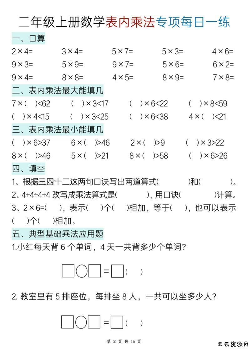 二上数学表内乘法综合小练笔15天-天云资源网
