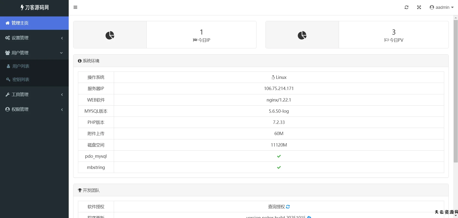后台功能:ip访问统计、sql命令工具、升级模块、管理员模块、会员模块、卡密模块