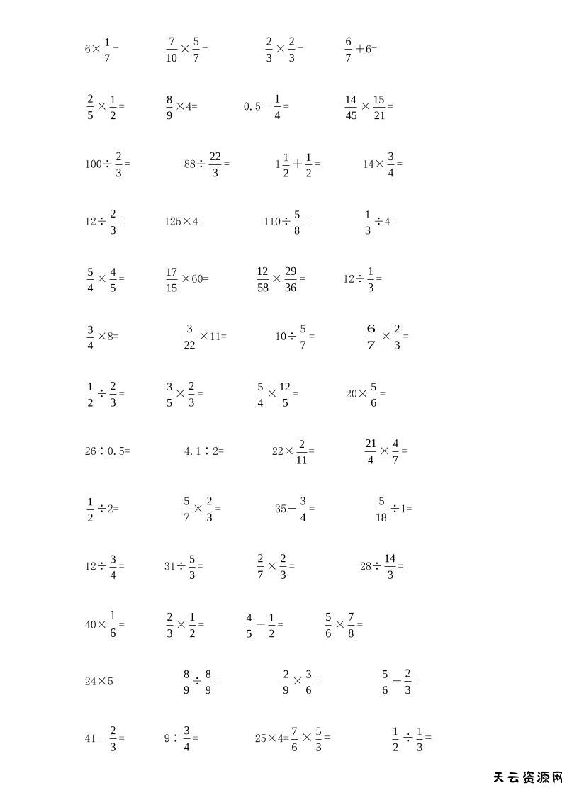 计算大作战!六上数学分数小数口算训练卡(200题)-天云资源网
