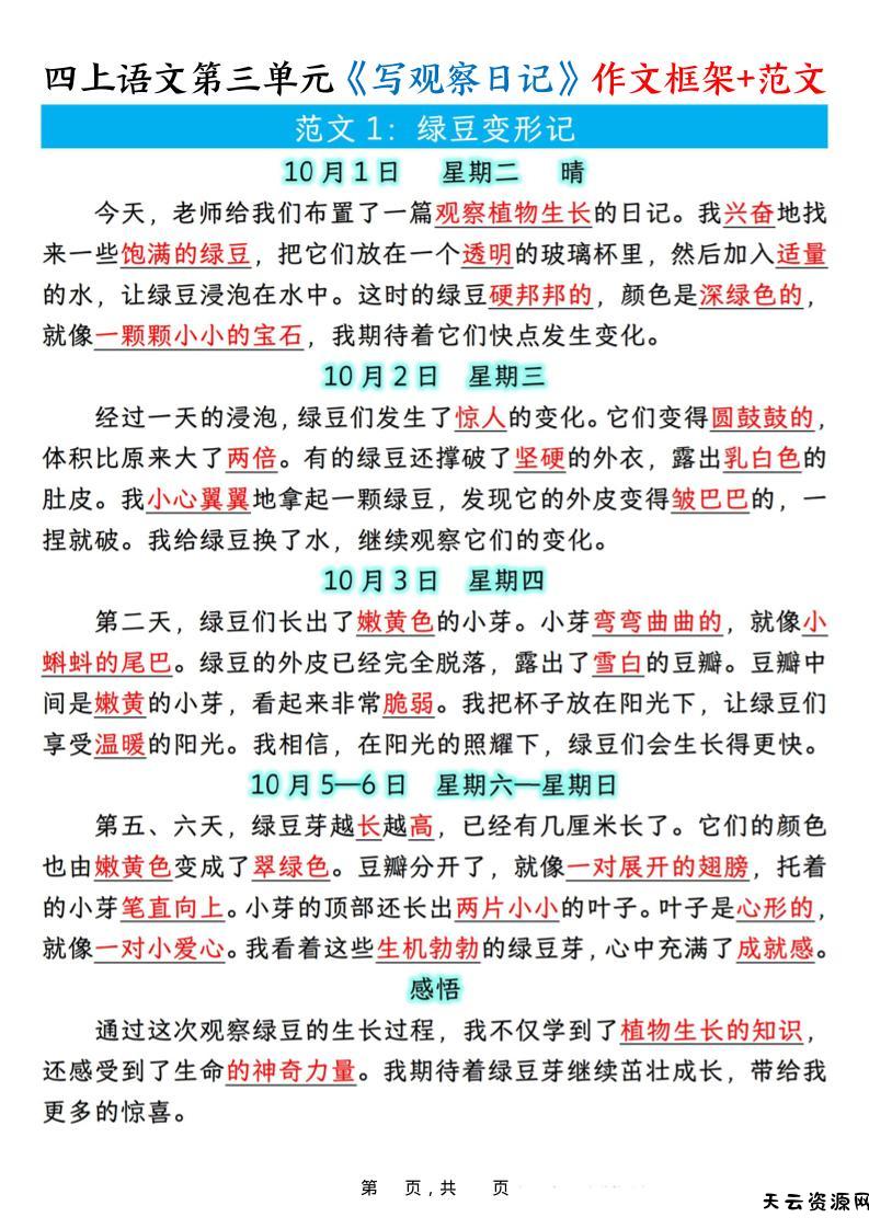 四上语文第三单元《写观察日记》作文支架+优秀范文10页-天云资源网