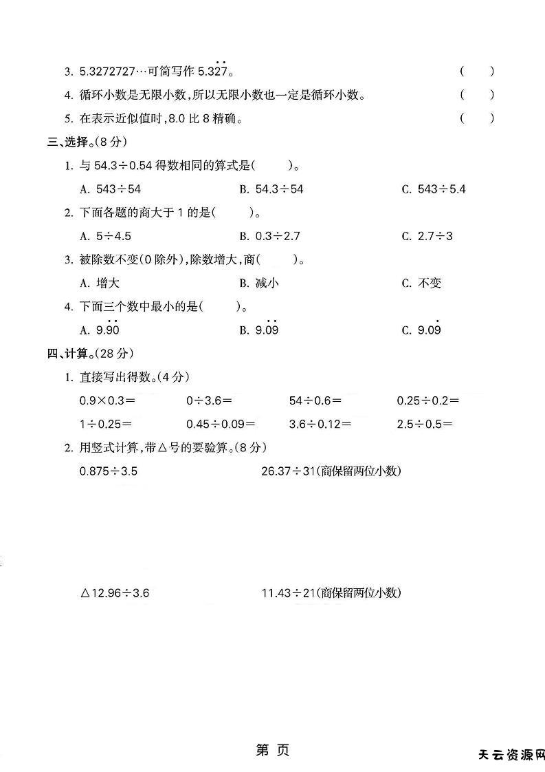 五年级上数学第三单元测试卷3《人教版》-天云资源网