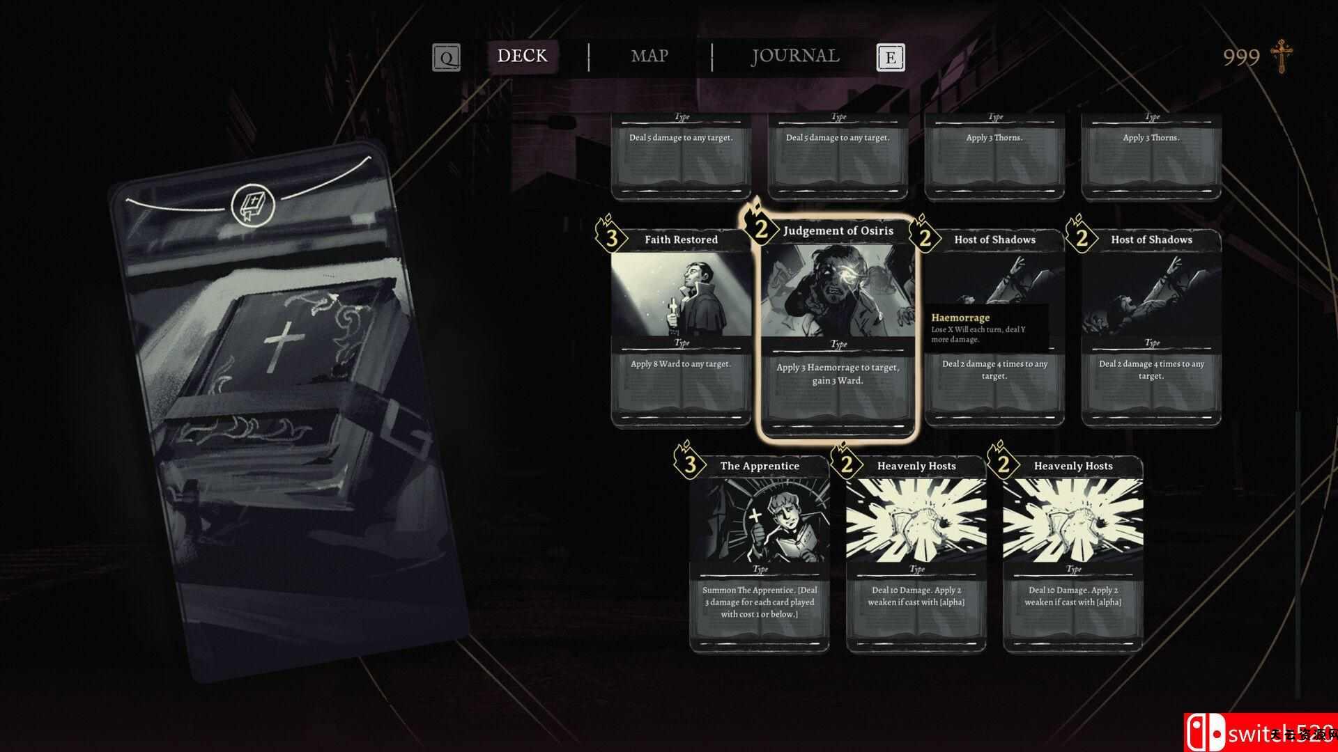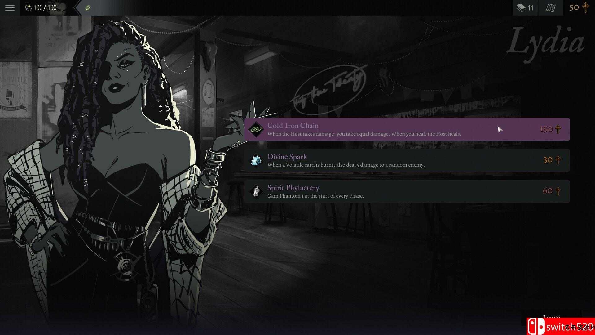 《玛丽斯》是一款策略类(SLG)游戏,你将扮演诺亚(Noah),一位曾为牧师、转为驱魔猎人的男人,穿梭于一座堕落腐化的城市。在夜间的行动中,你将执行驱魔仪式,以卡牌构筑的机制对抗附身者及恶魔势力。每局游玩都是新的挑战:你需要燃烧卡牌以点燃蜡烛(Candles),再用蜡烛为其他卡牌提供能量;在不断的回合中,保护自己的意志(Will)并揭露并驱逐恶魔。switch520