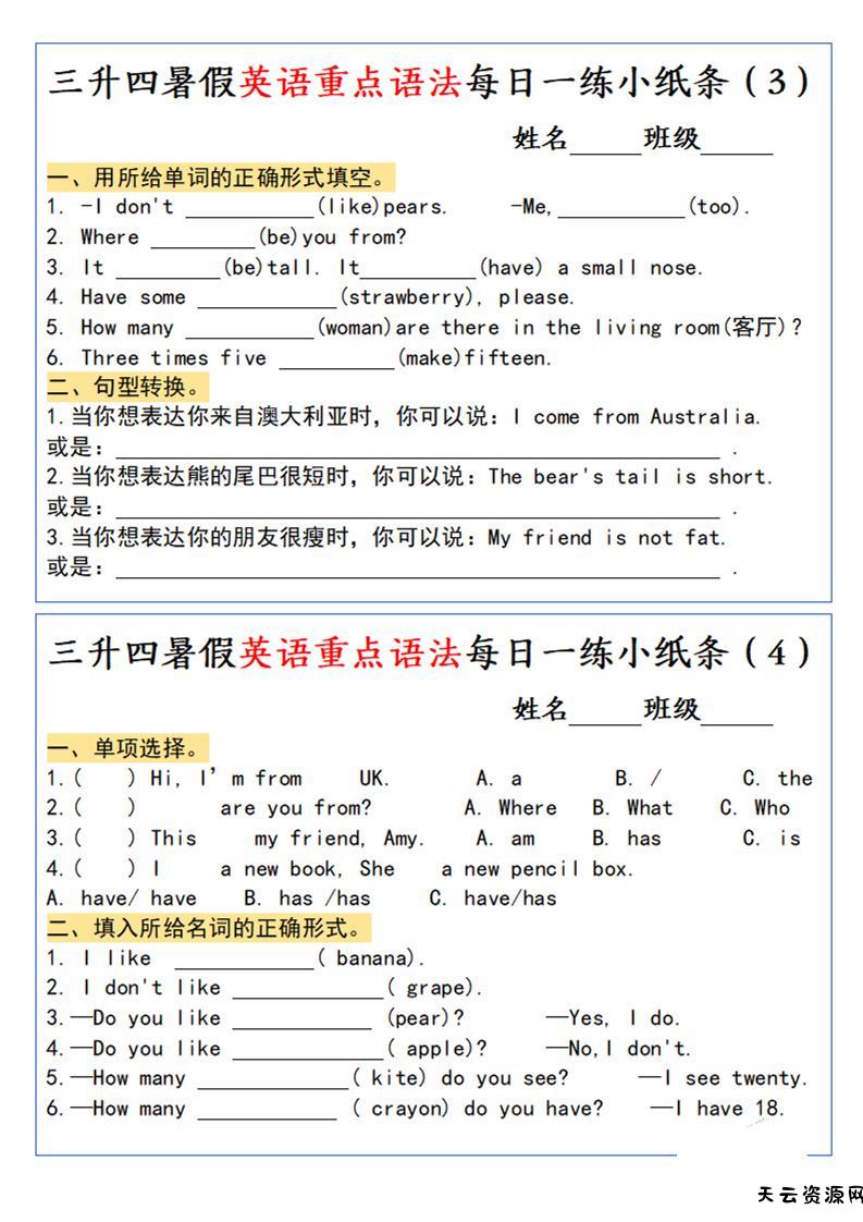 三升四英语小纸条语法每日一练-四上英语-天云资源网