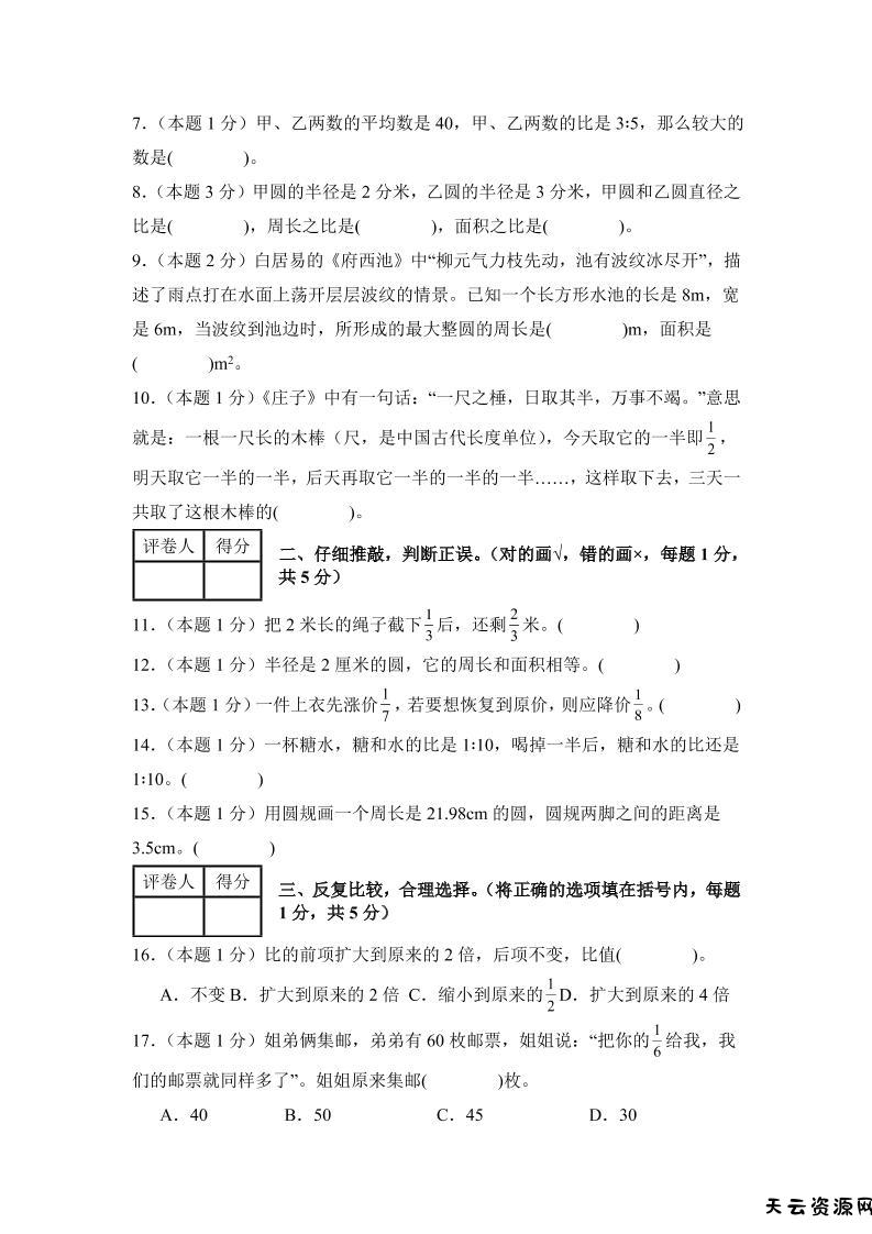 六年级上西师版数学期中测试卷2-天云资源网