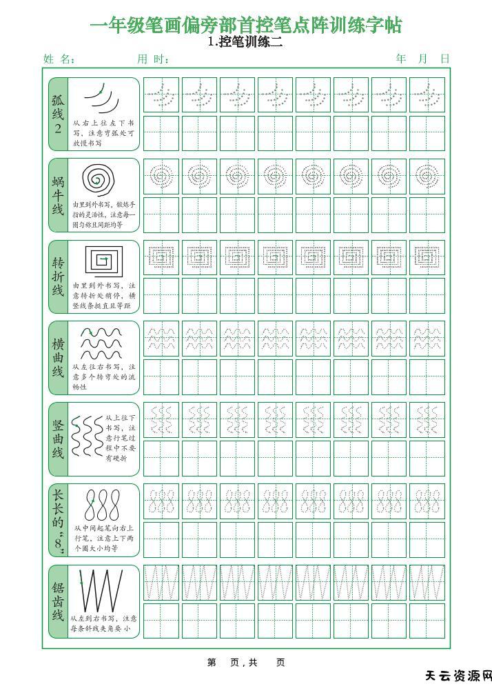 一年级上语文笔画偏旁部首控笔点阵训练字帖-天云资源网