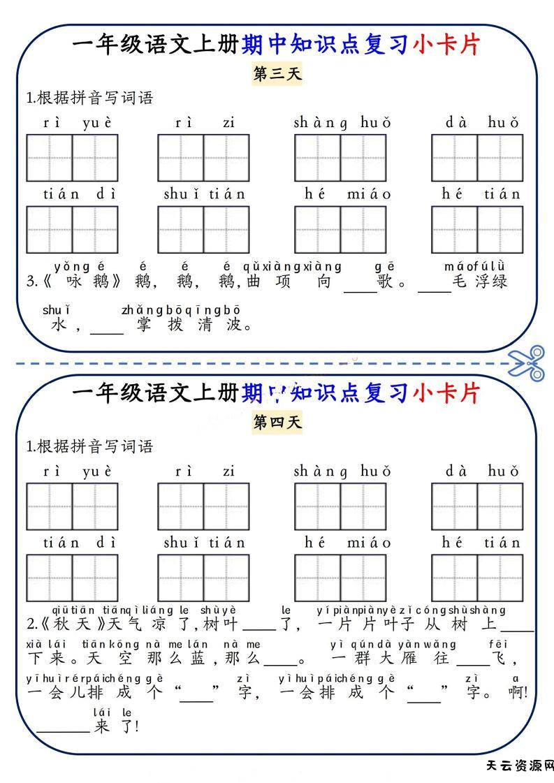 一年级上语文期中知识点复习小卡片-天云资源网
