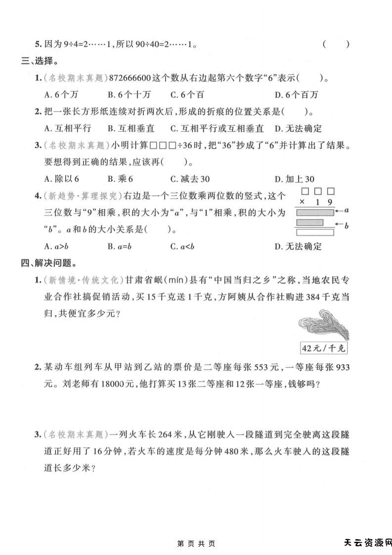 四年级上数学常考易错题训练-天云资源网