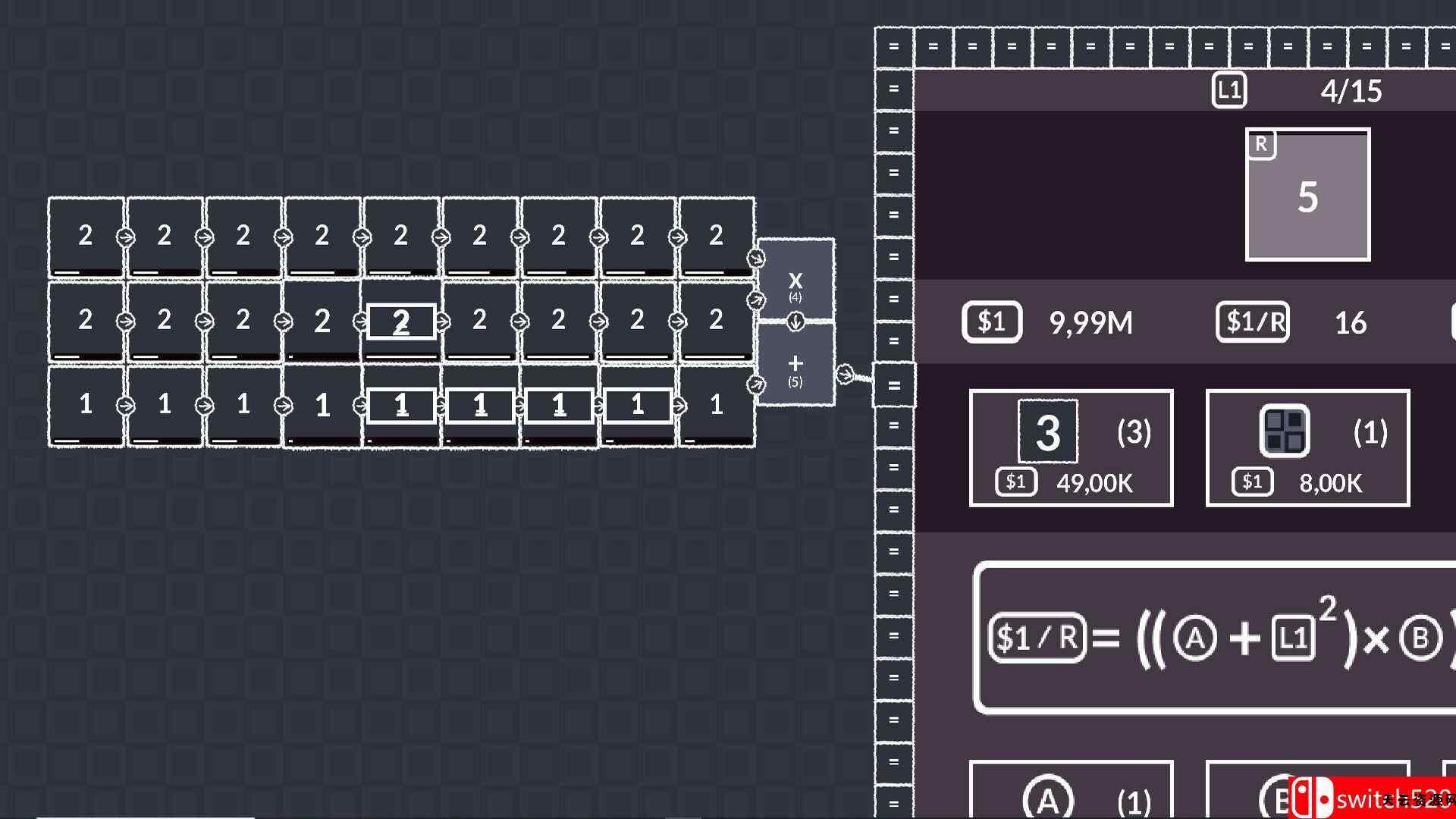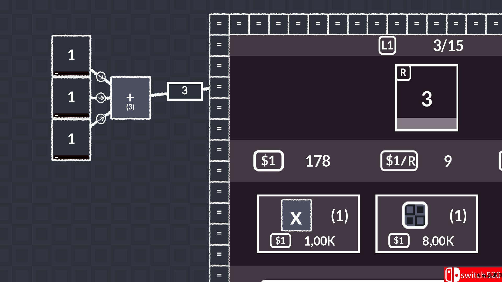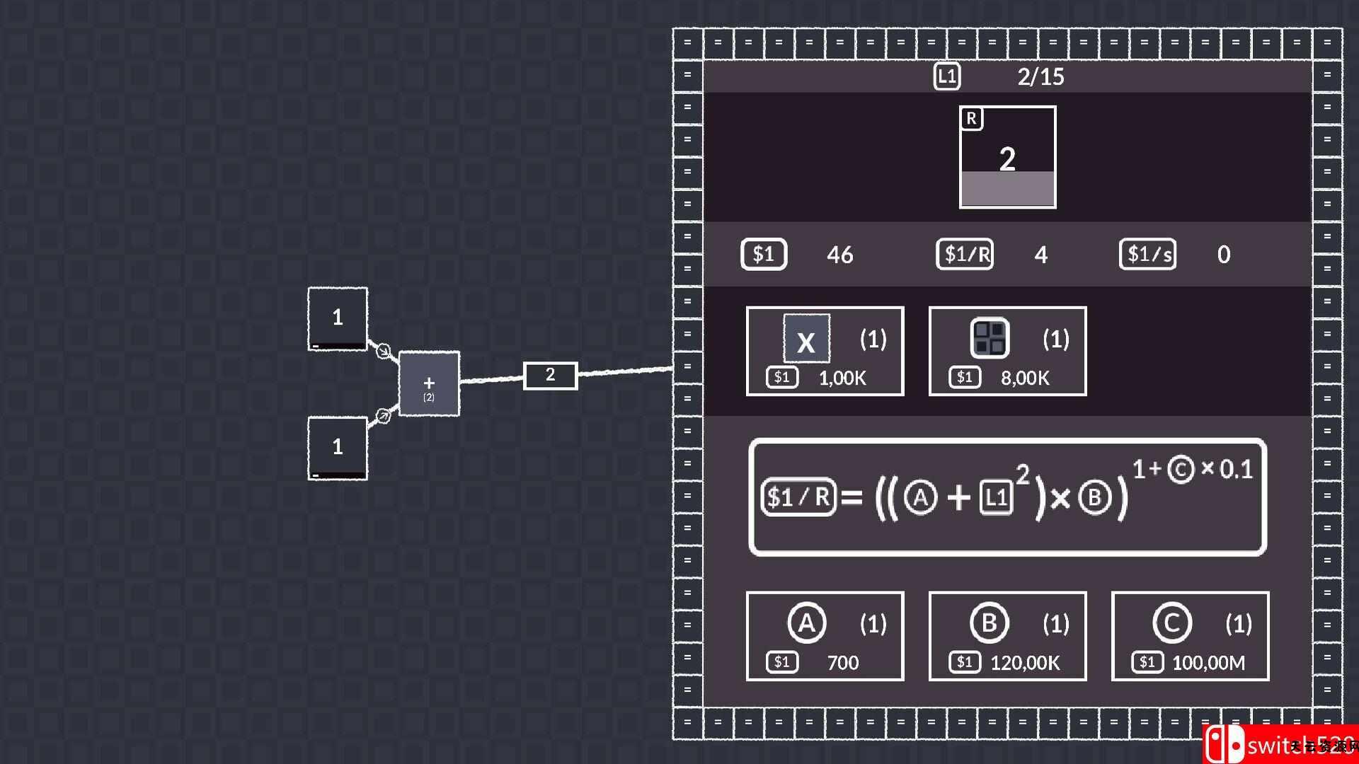 《节点数学》是一款模拟经营类(SIM)游戏,《节点数学》是一款简单的空闲工厂类游戏,玩家将通过组合数字与数学运算符、解锁新内容,并从中获得收益。开发者用一句话总结:“Combine numbers with operators · Make money · Buy new nodes and upgrades” (结合数字与运算符 · 赚钱 · 购买新节点与升级) 。switch520