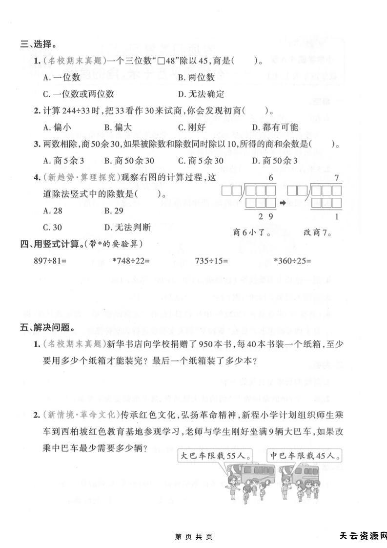 四年级上数学除数是两位数的除法专项练习-天云资源网