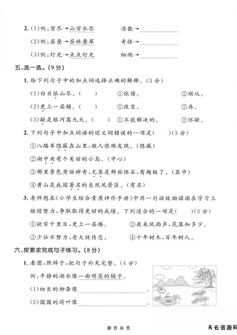 二年级上语文第四单元模拟测试卷3-天云资源网