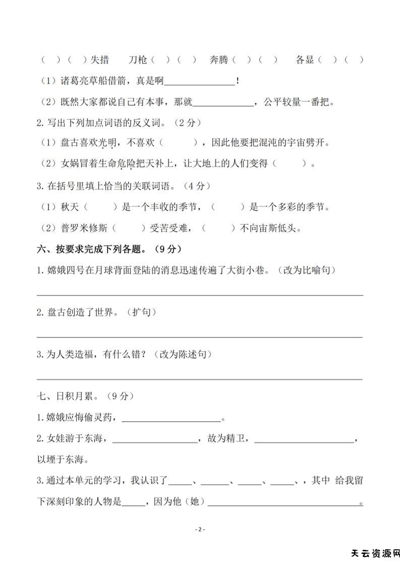 四年级上语文第四单元检测试卷3-天云资源网