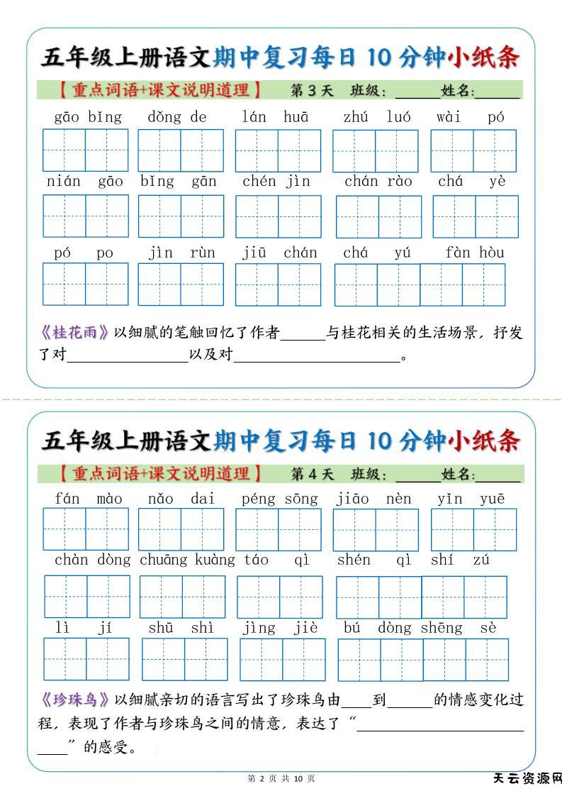 五年级上册语文期中复习小纸条【重点字词+课文说明道理】-天云资源网