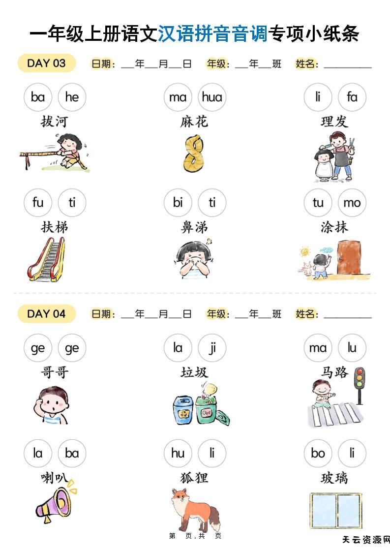新一上语文汉语拼音音调专项练习小纸条18天(9页)-天云资源网