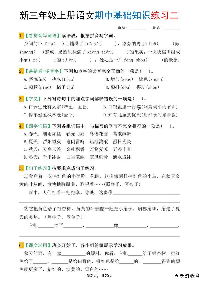 新三上语文期中基础知识练习10套(含答案20页)-天云资源网