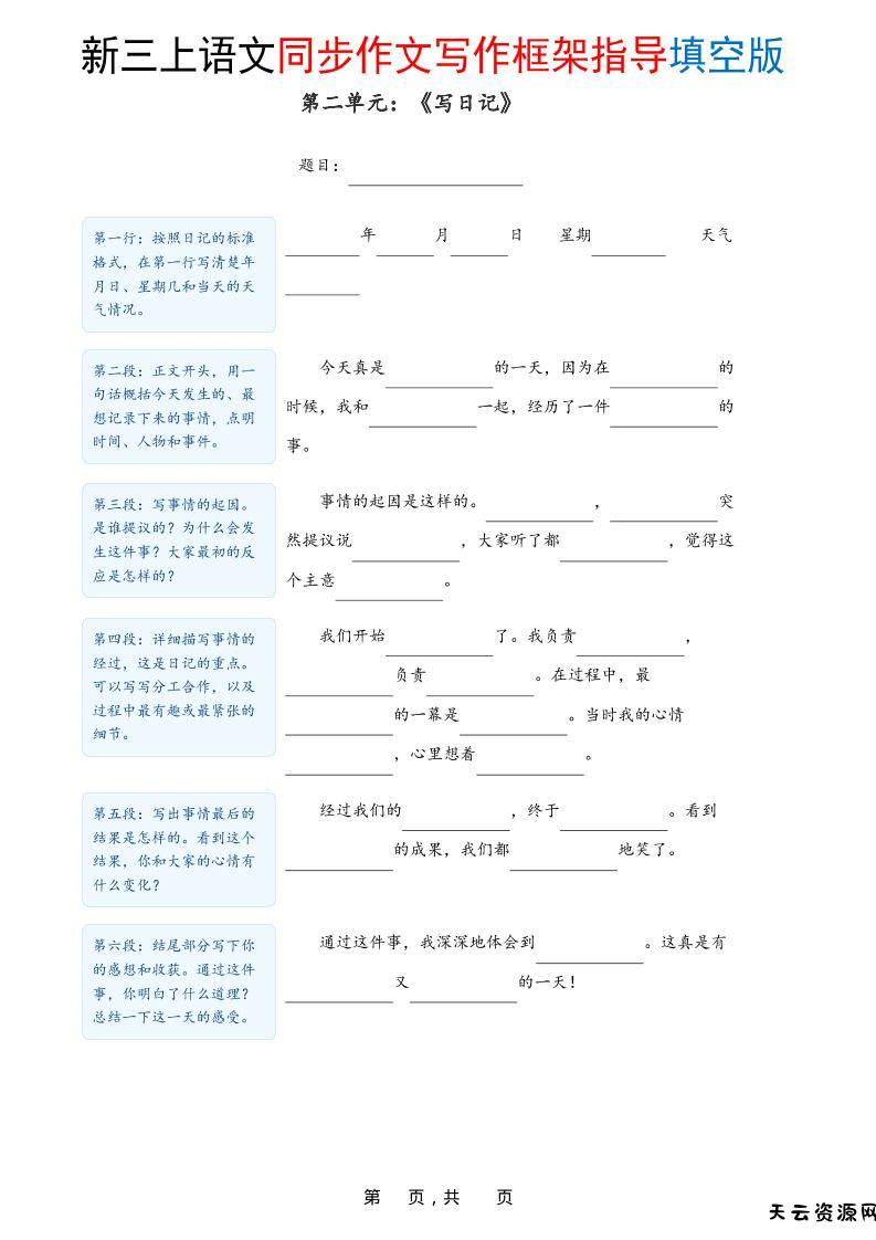 新三上语文1-8单元同步作文写作框架指导填空版(含答案16页)-天云资源网