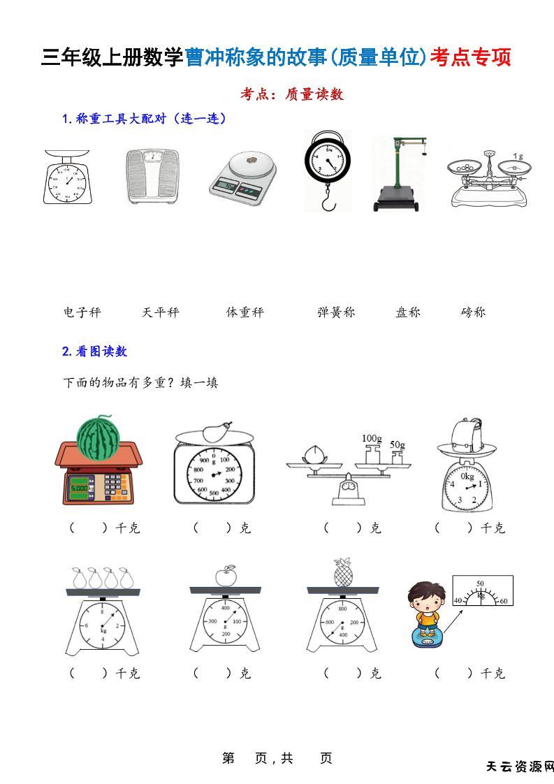 新三上数学曹冲称象的故事(质量单位)考点专项训练(含答案20页)-天云资源网