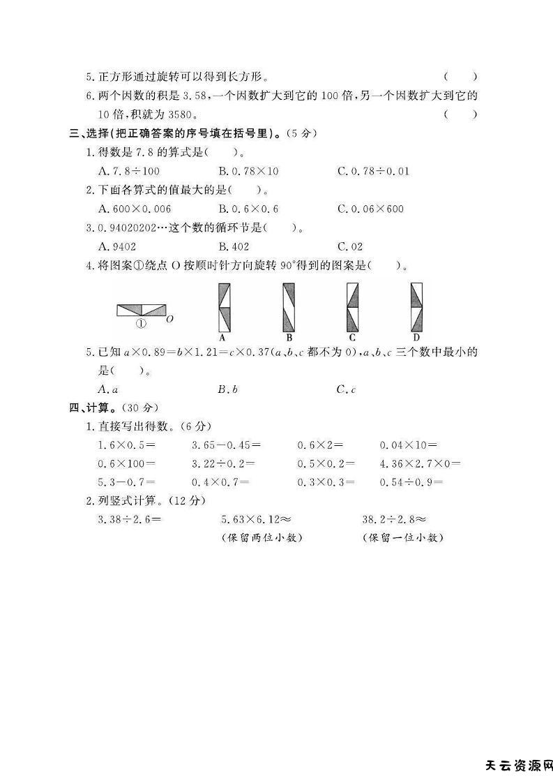 五年级上数学期中测试卷1《西师版》-天云资源网