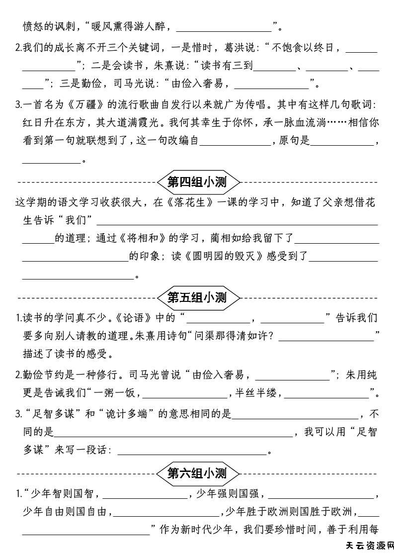按课文内容填空】五年级上册语文1-4单元期中复习小测-含答案-天云资源网