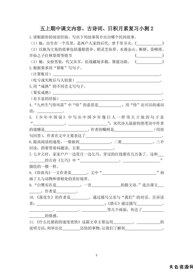 五上语文期中古诗词日积月累复习小测(附答案)-天云资源网