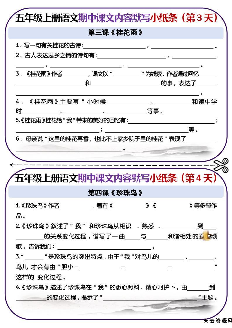 五上语文-课文填空专项小纸条-第1-4单元-天云资源网