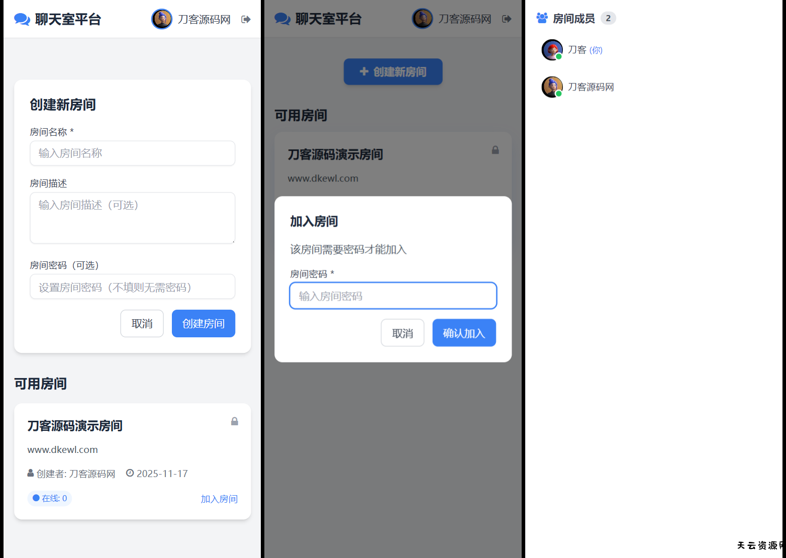 房间管理:支持创建带密码保护的群聊房间,加入房间需要验证