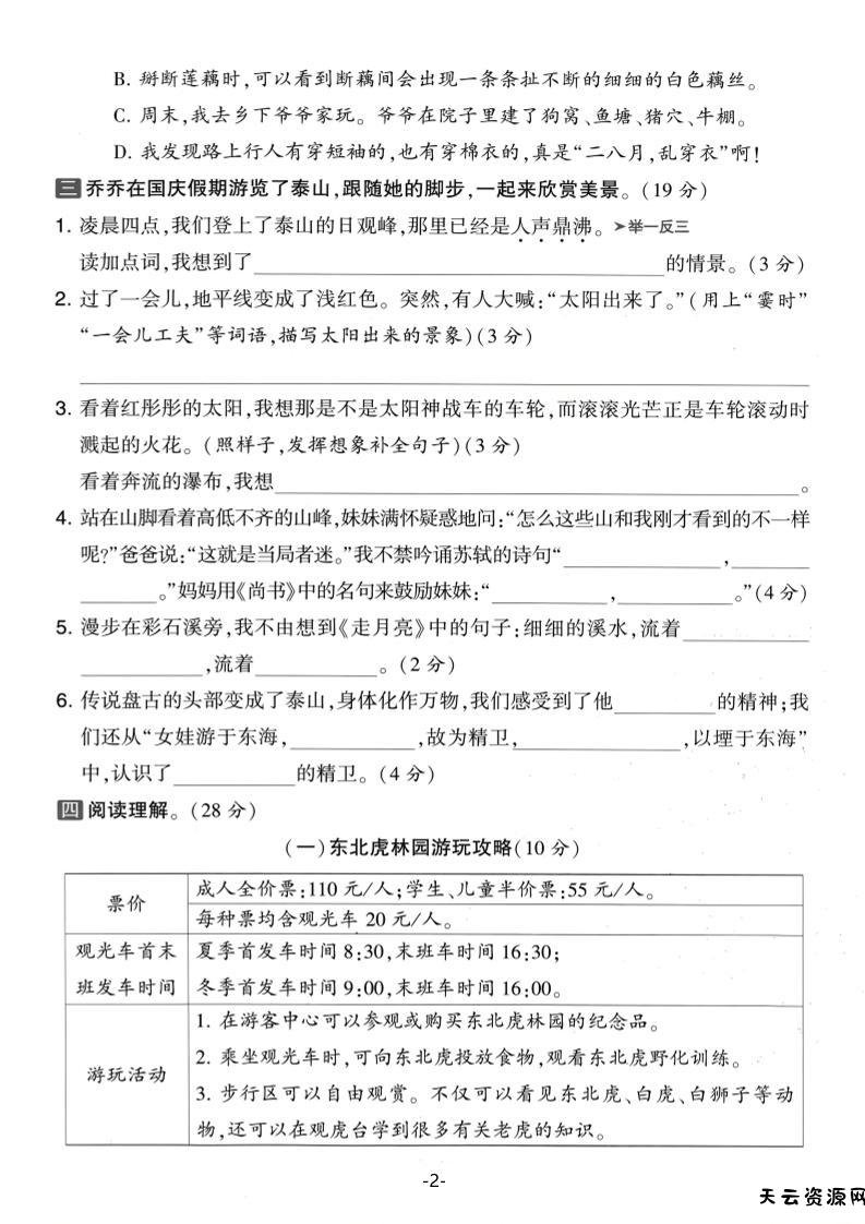 25学年四上语文期中素养达标卷(含答案5页)-天云资源网