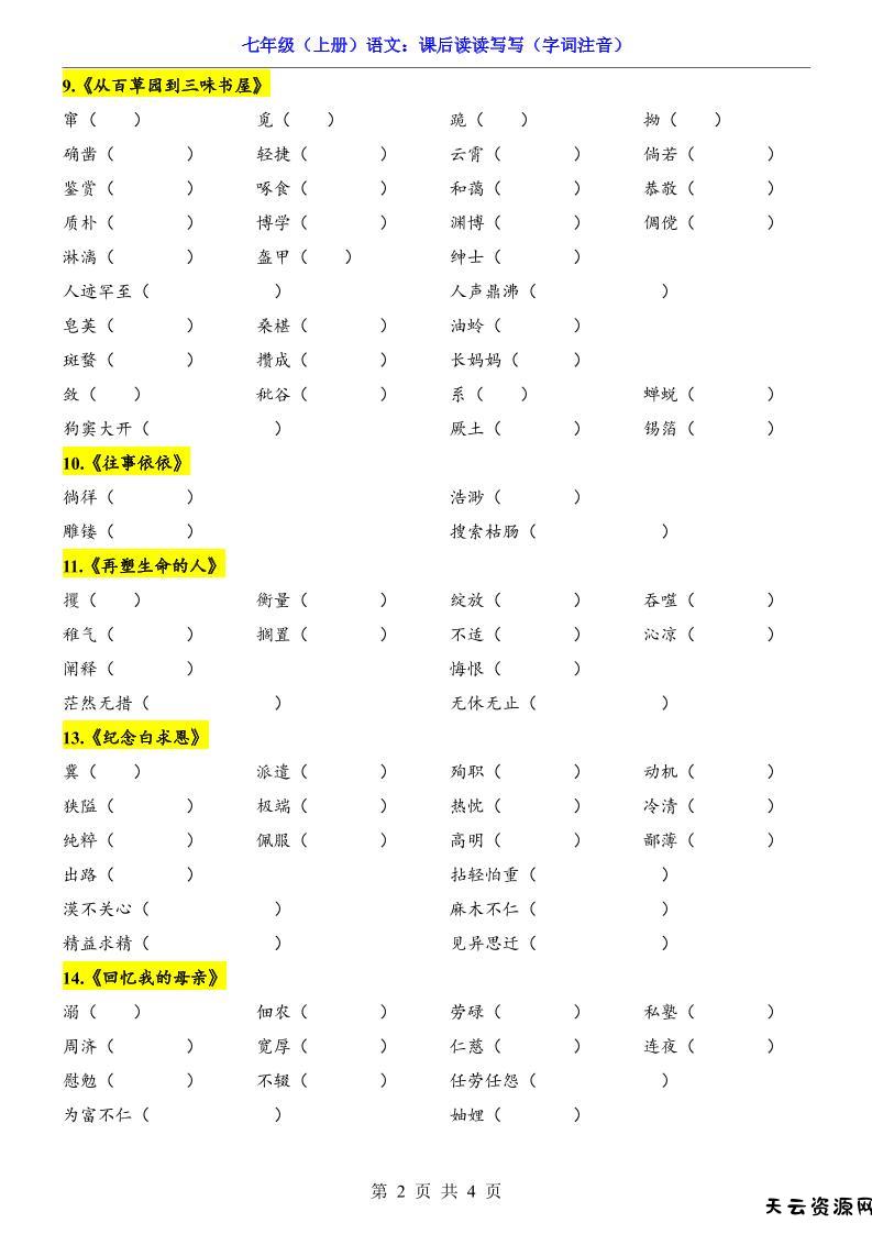 七年级上语文课后读读写写字词注音-天云资源网
