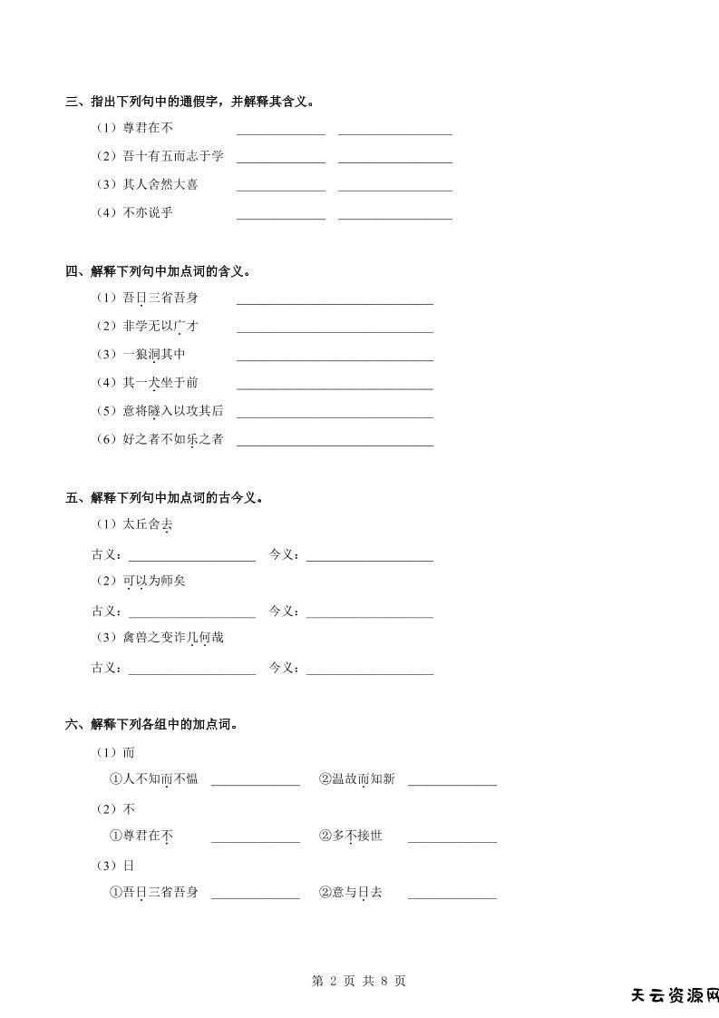 七年级上语文课内文言文专题训练1-天云资源网