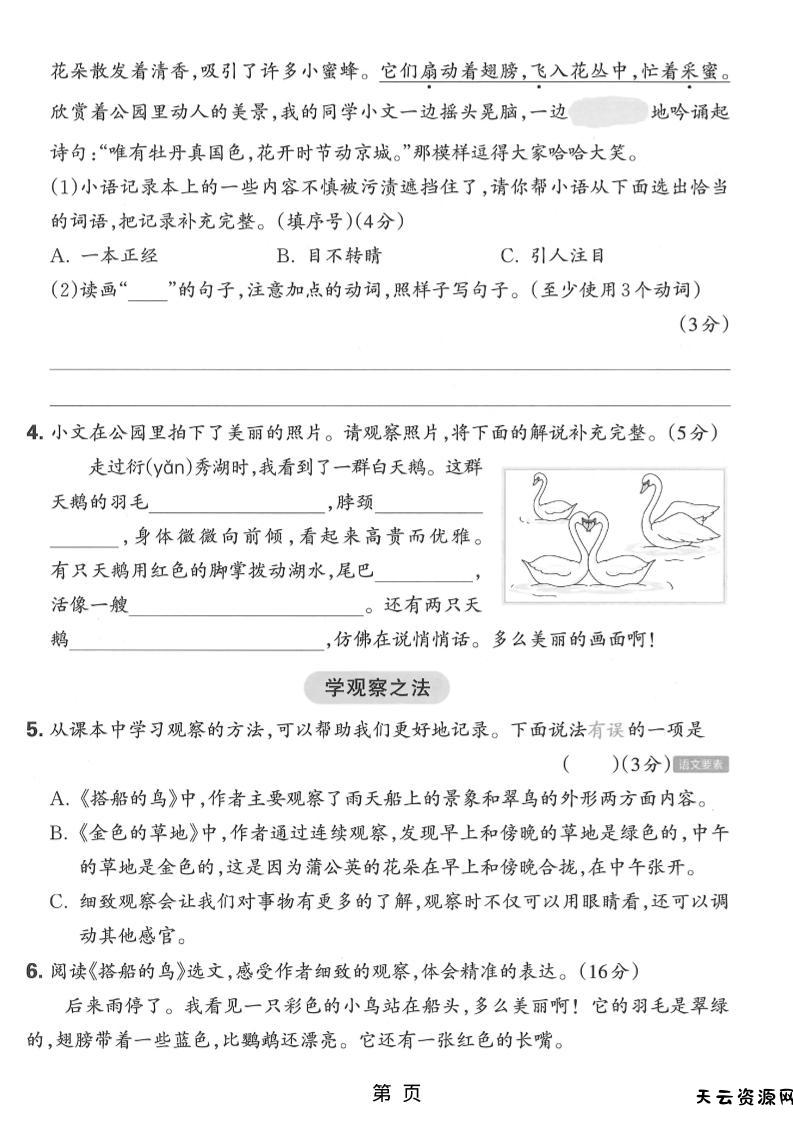 三年级上语文第五单元达标测试卷-天云资源网