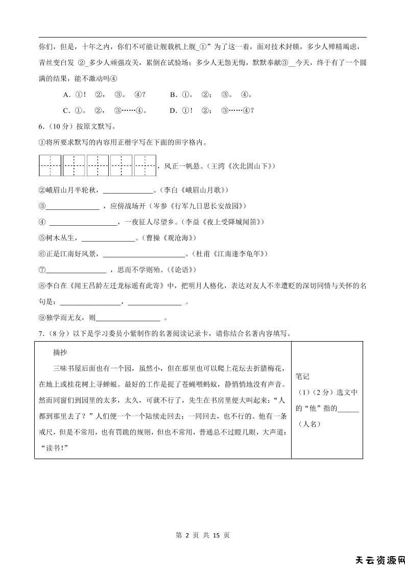 七年级上语文期中模拟卷02-天云资源网