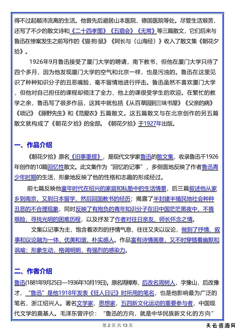 七年级上语文名著《朝花夕拾》考点汇总-天云资源网