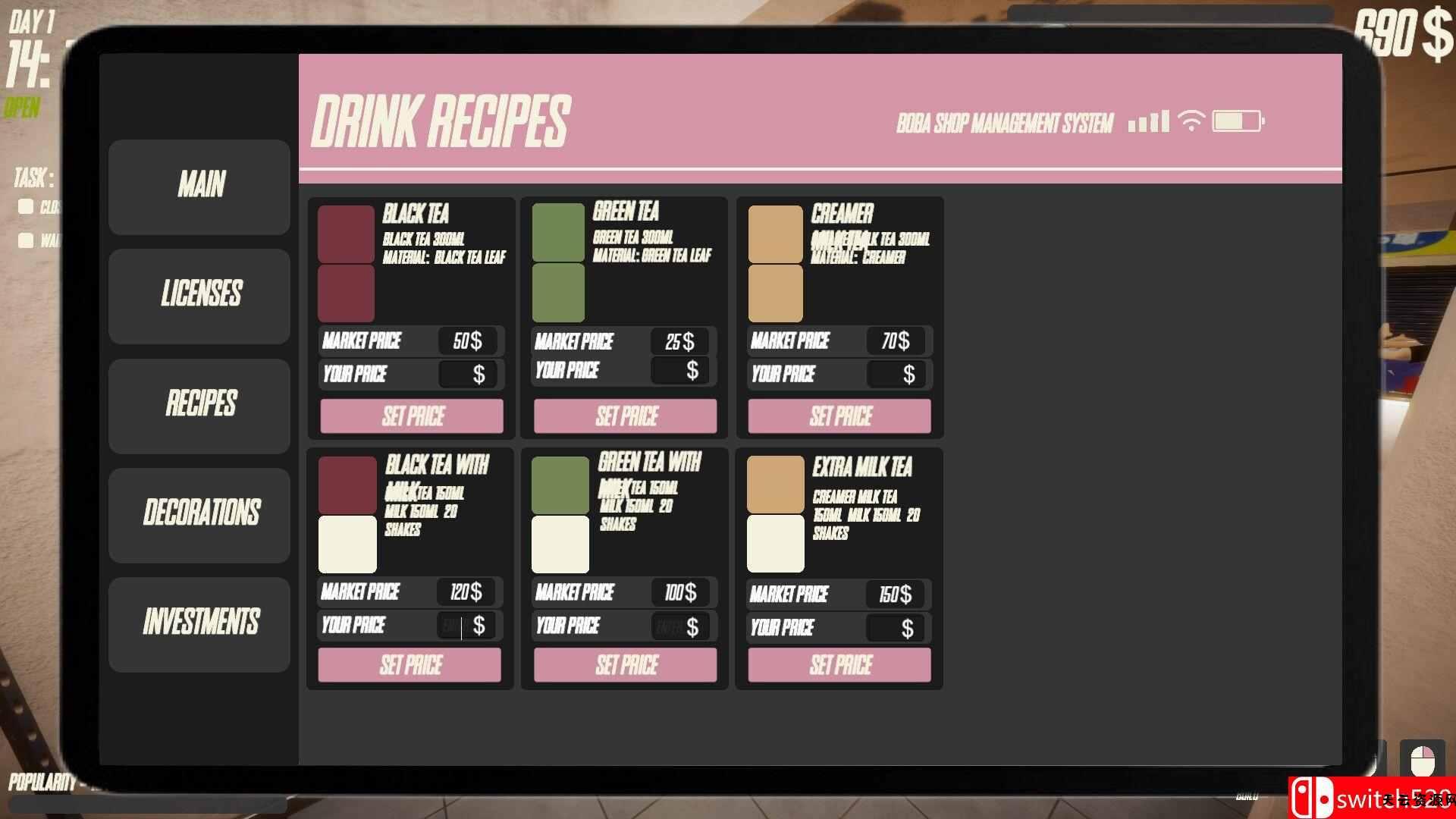 《奶茶店模拟器》是一款模拟经营类(SIM)游戏,制作各种饮料和珍珠奶茶。使用游戏的有趣物理与世界互动,完成每个奶茶店经理都会遇到的杂务。聪明地投资你的钱或购买装饰品来定制自己的商店,将你的奶茶店发展成一个世界知名的品牌。switch520