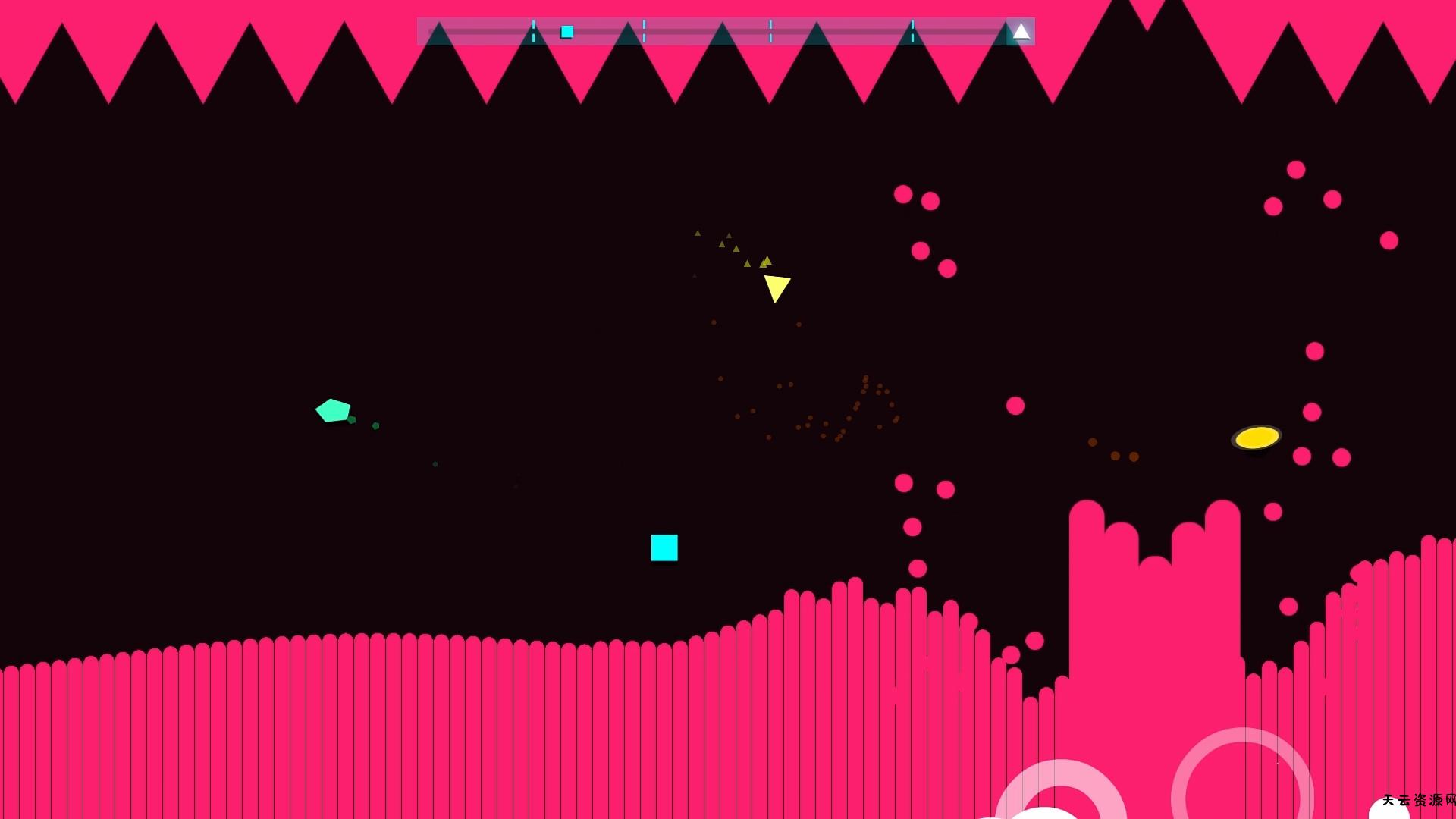 游戏的核心玩法纯粹到令人上瘾:没有攻击,只有躲避。每一首曲子都是一个独特的关卡,音乐的每一个鼓点、每一条旋律,都化身为屏幕上飞舞、缩放、旋转的致命形状。你需要集中全部注意力,跟随节奏预判弹幕的轨迹,在几何风暴的缝隙中穿梭。虽然规则简单,但挑战性极高,那种成功躲过一连串复杂攻击、与音乐完美同步的感觉无与伦比。游戏支持本地四人合作,当屏幕上同时出现四个小方块在弹幕中狼狈而优雅地共舞时,混乱与欢乐将达到顶点。炫目的霓虹视觉效果和超燃的原创电子乐,构成了这场独一无二的视听盛宴。