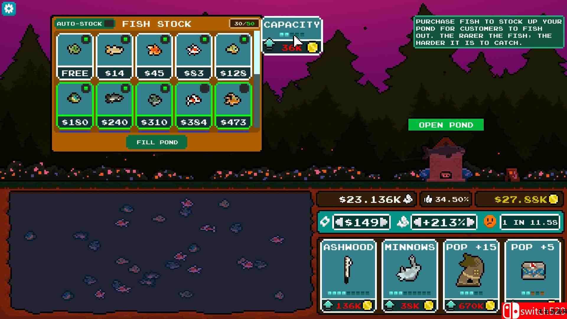 《口袋放置:钓鱼池塘》是一款模拟经营类(SIM)游戏,《口袋放置:钓鱼池塘》是一款轻松愉快的休闲放置经营游戏。在这款游戏中,你获得了一个坐落在静谧森林中的迷人池塘,并有机会打造一个传奇钓鱼天堂。你可以引入各种从普通到稀有的鱼类,升级钓具与饵料,提升顾客的钓鱼体验,并通过装饰与口碑管理让你的池塘成为钓鱼爱好者的胜地。switch520