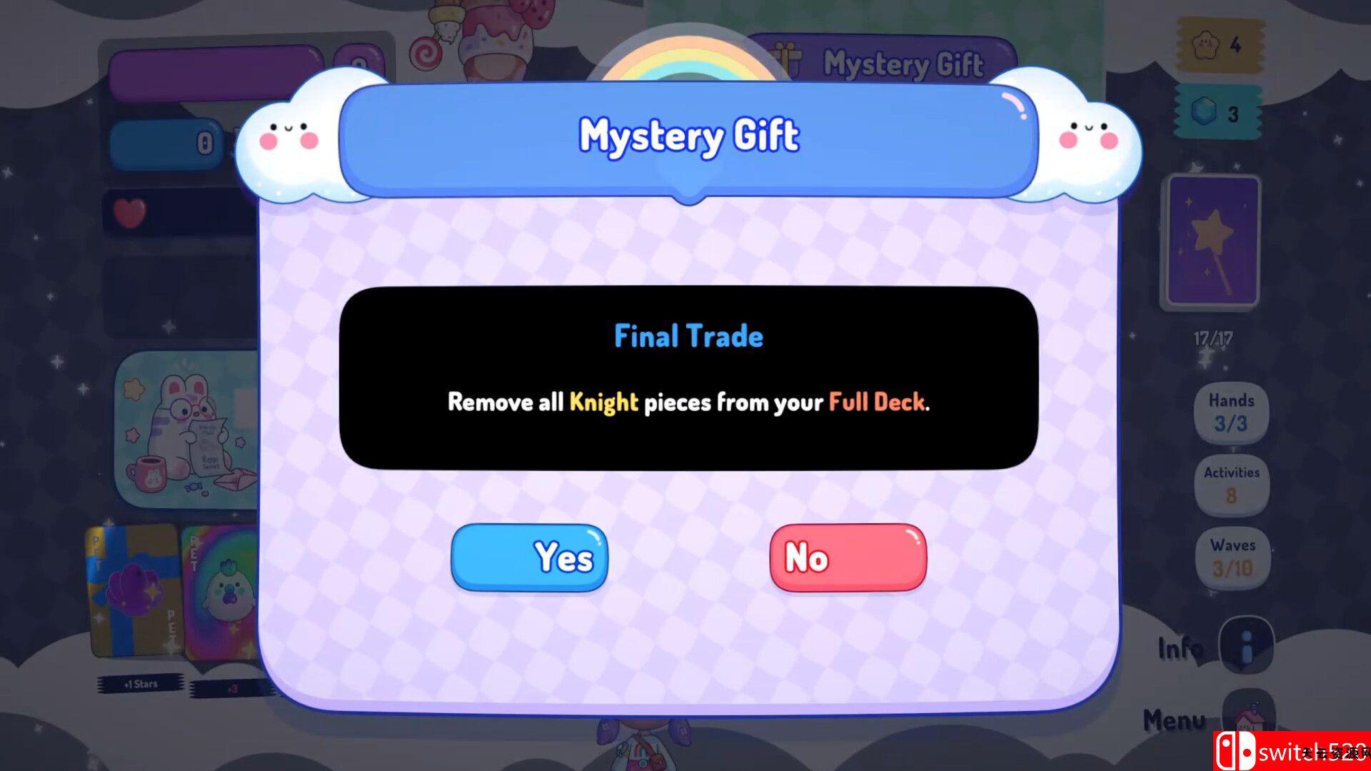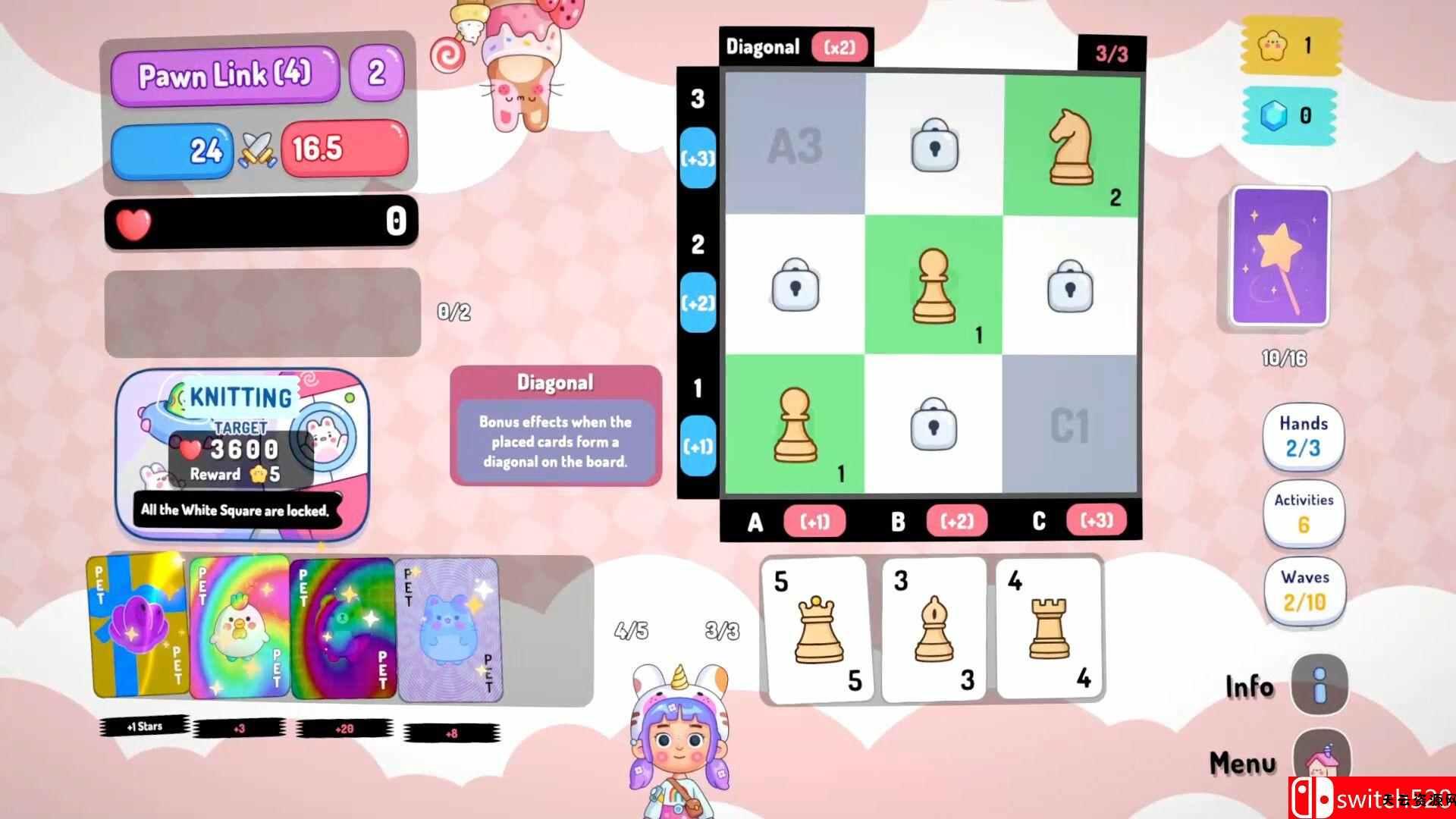 《独棋奇谋》是一款策略类(SLG)游戏,一款棋类肉鸽卡牌游戏。将卡牌打在3×3棋盘上,触发棋子效果,通过连击得分。用宠物和食物构建卡组,征服一波波独特战斗。switch520