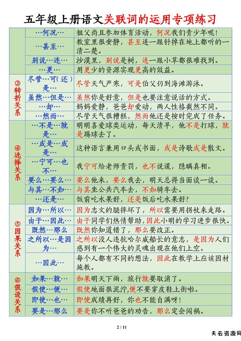 五上语文关联词语的运用专项练习(11页)-天云资源网