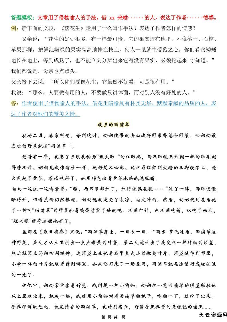 五上语文1-8单元阅读考点与答题模板-天云资源网