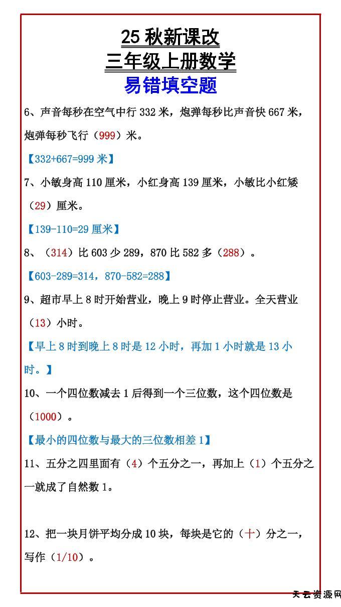 【2025秋新版】三年级上册数学易错填空题-天云资源网