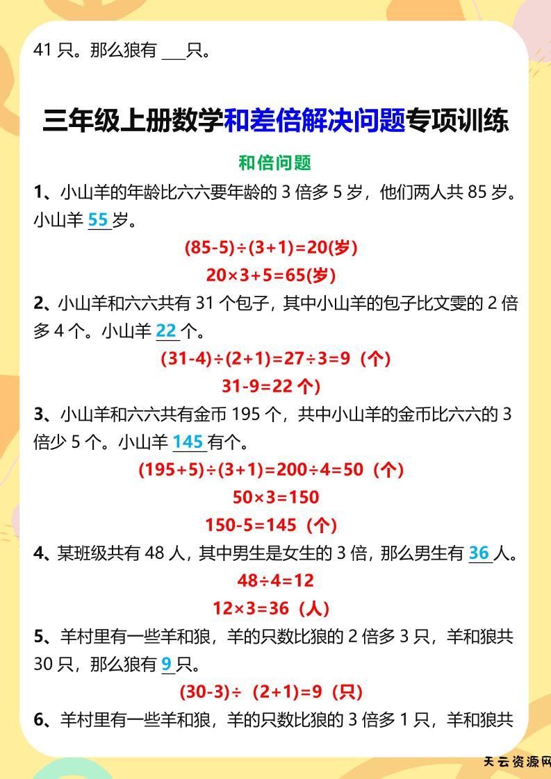 【2025秋新版】三年级上册数学和差倍解决问题专项训练-天云资源网