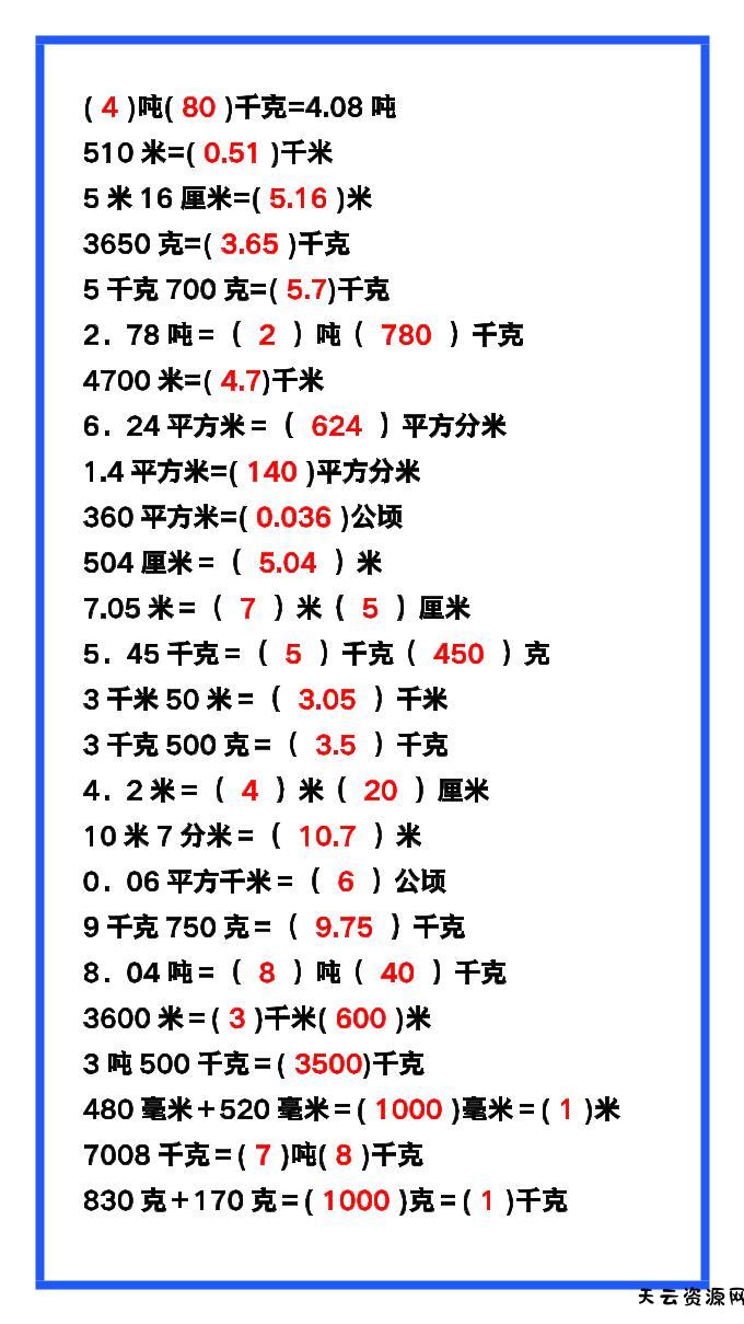 【2025秋新版】五年级数学上册《单位换算》练习题,预习必备!-天云资源网