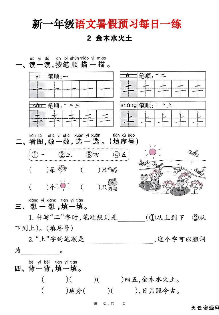 新一年级上册语文暑假预习每日一练(45页)-天云资源网