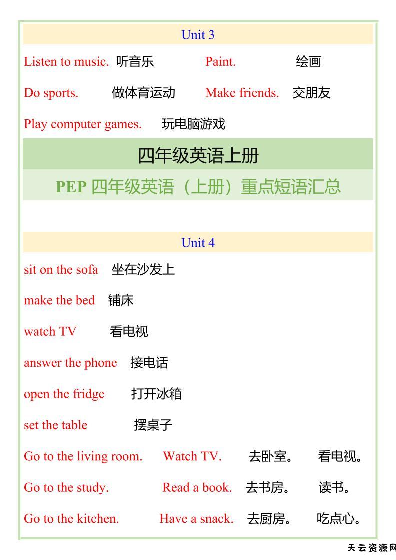 【2025秋新版】四年级英语(上册)重点短语汇总-天云资源网