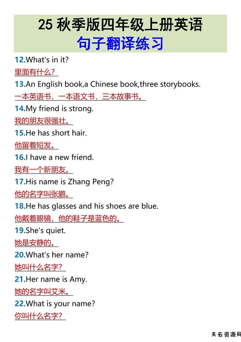 【2025秋新版】四年级上册英语•句子翻译练习-天云资源网