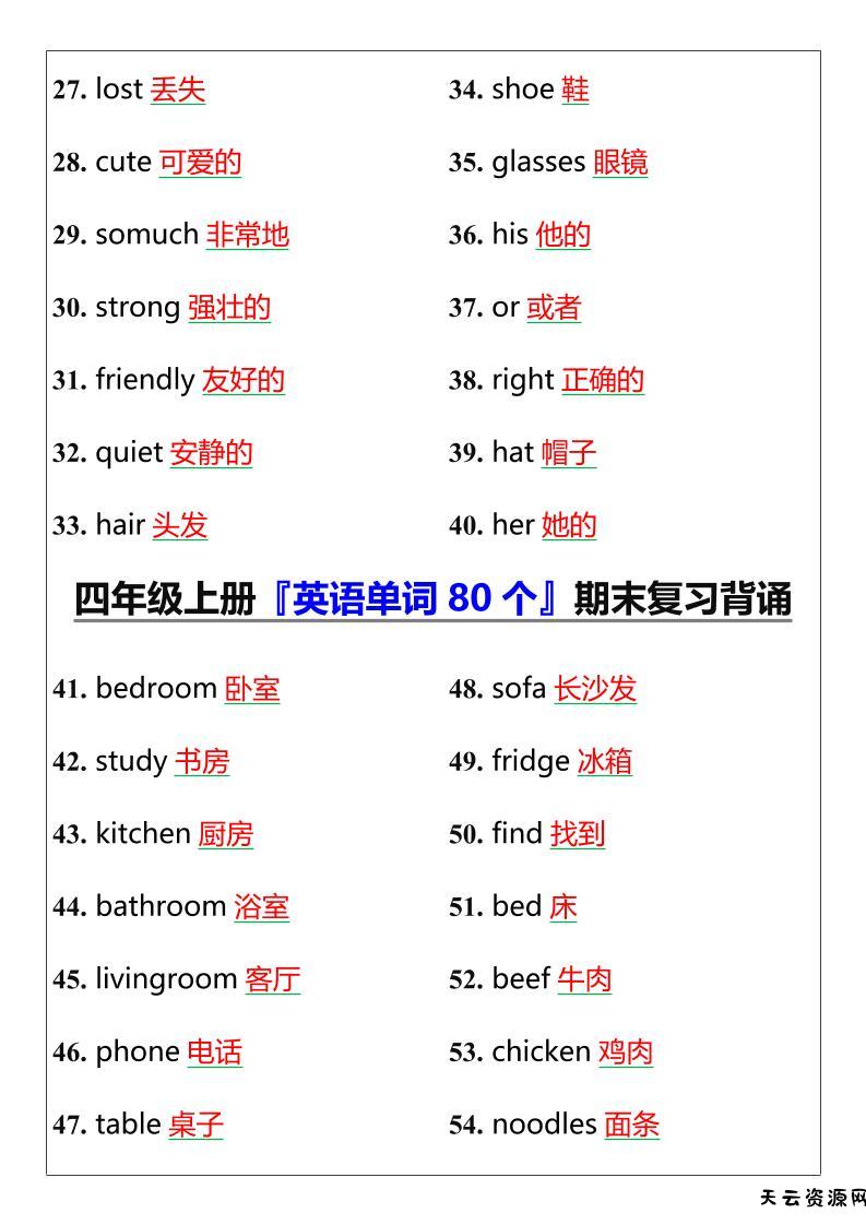 【2025秋新版】四年级上册『英语单词80个』期末复习背诵-天云资源网