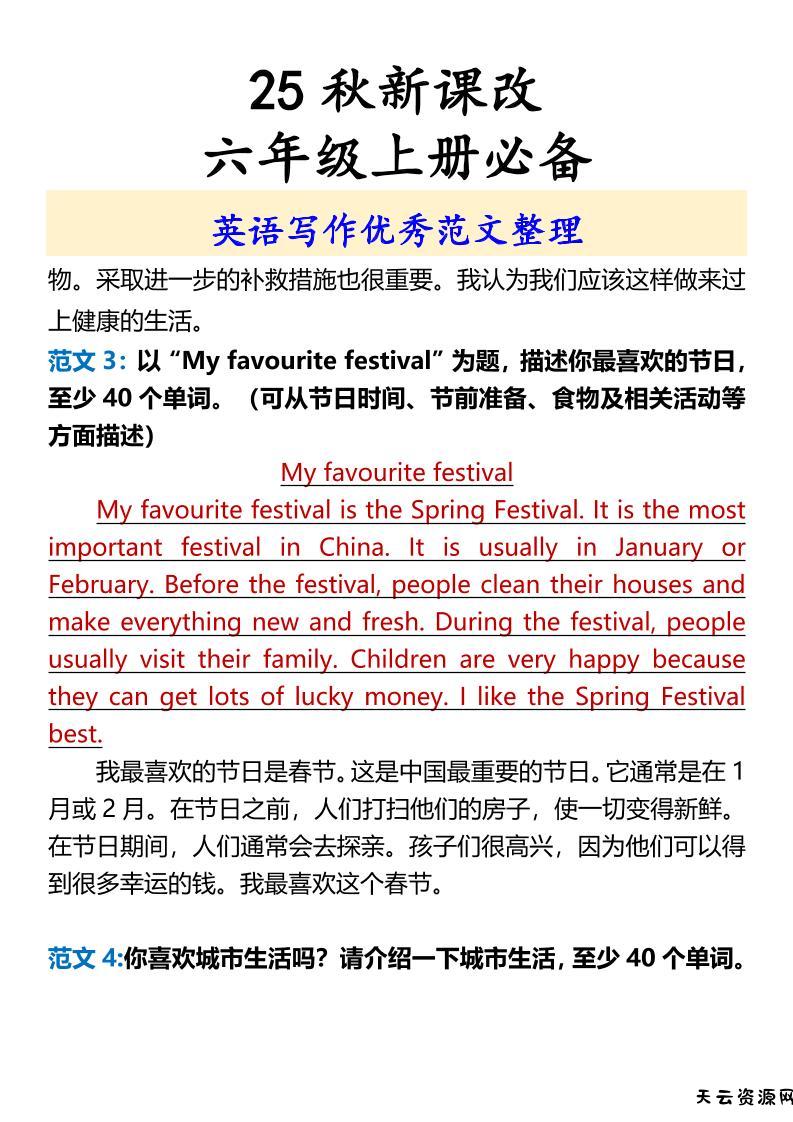 【2025秋新版】六年级上册必备英语写作优秀范文整理-天云资源网