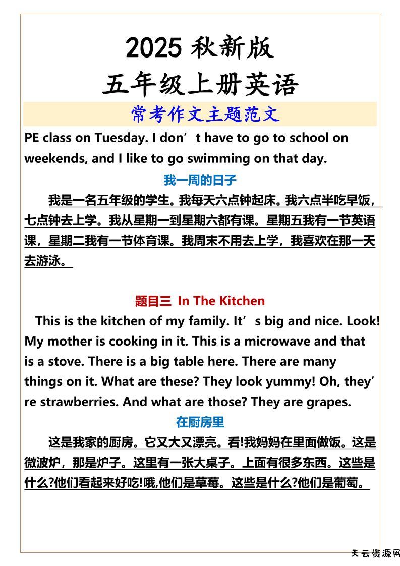 【2025秋新版】五年级上册英语常考作文主题范文-天云资源网