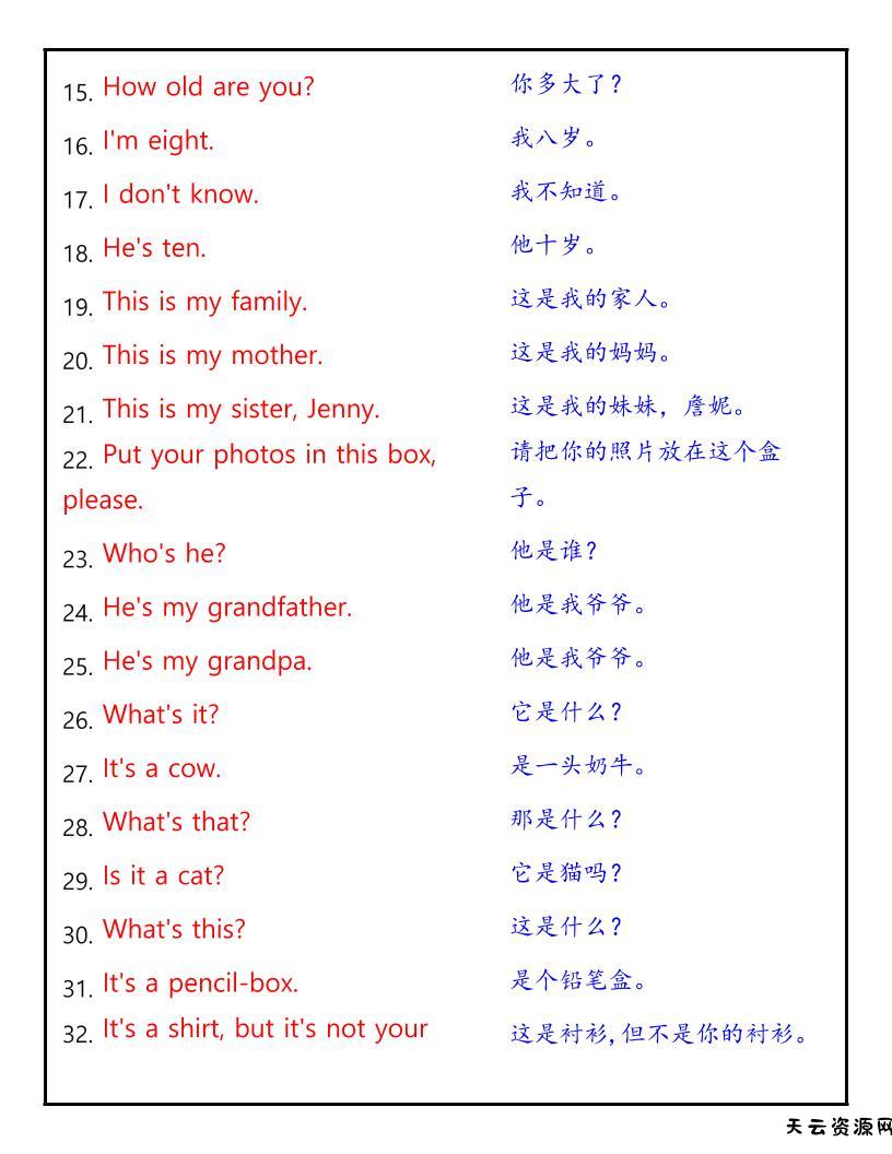 【2025秋新版】三年级英语上册《重点句子》中英文对照-天云资源网