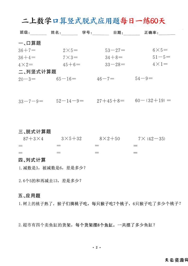 二上数学口算竖式脱式应用题每日一练60天(60页)-天云资源网