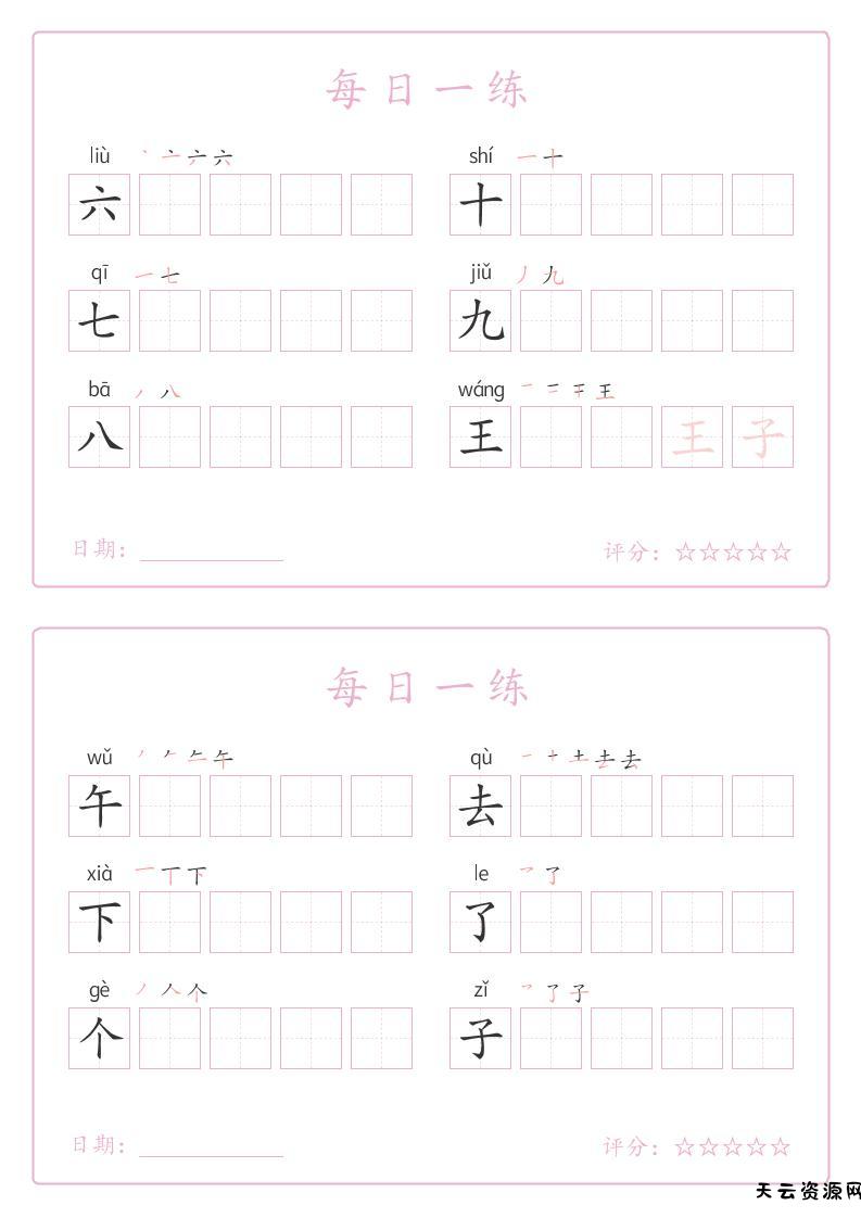 25秋一年级上册语文写字表每日一练字帖(5字版)9页-天云资源网