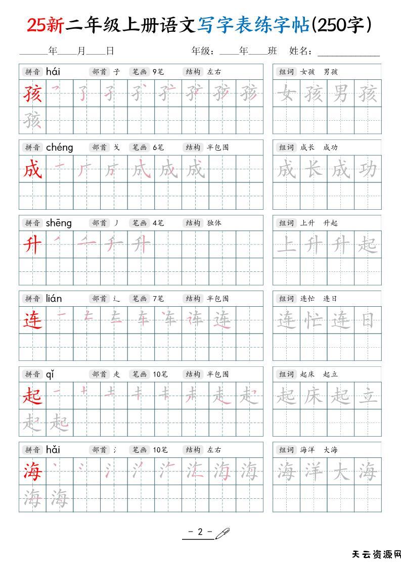 25新二上语文写字表练字贴(250字)42页-天云资源网